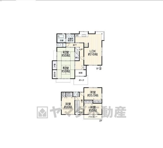 LDK16畳(1F)、和6畳(1F)、和8畳(1F)、洋6畳(2F)、洋5.5畳(2F)、洋5畳(2F) |