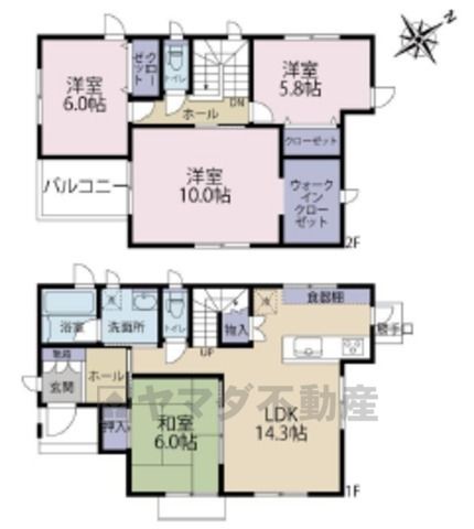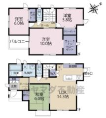 LDK14.3畳(1F)、和6畳(1F)、洋10畳(2F)、洋6畳(2F)、洋5.8畳(2F) |