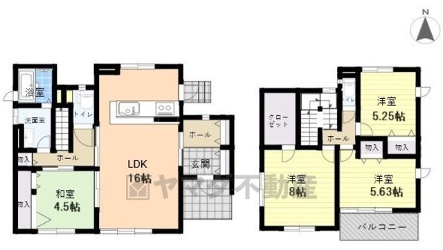 LDK16畳(1F)、和4.5畳(1F)、洋8畳(2F)、洋5.6畳(2F)、洋5.2畳(2F) |