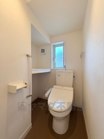 1階トイレ:手すりと棚があり便利