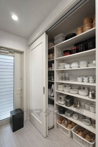 ・キッチン回りにパントリーや収納があり、調理用品やストック食材などをたっぷり収納できます。しかも扉つきなのでお部屋がすっきり。